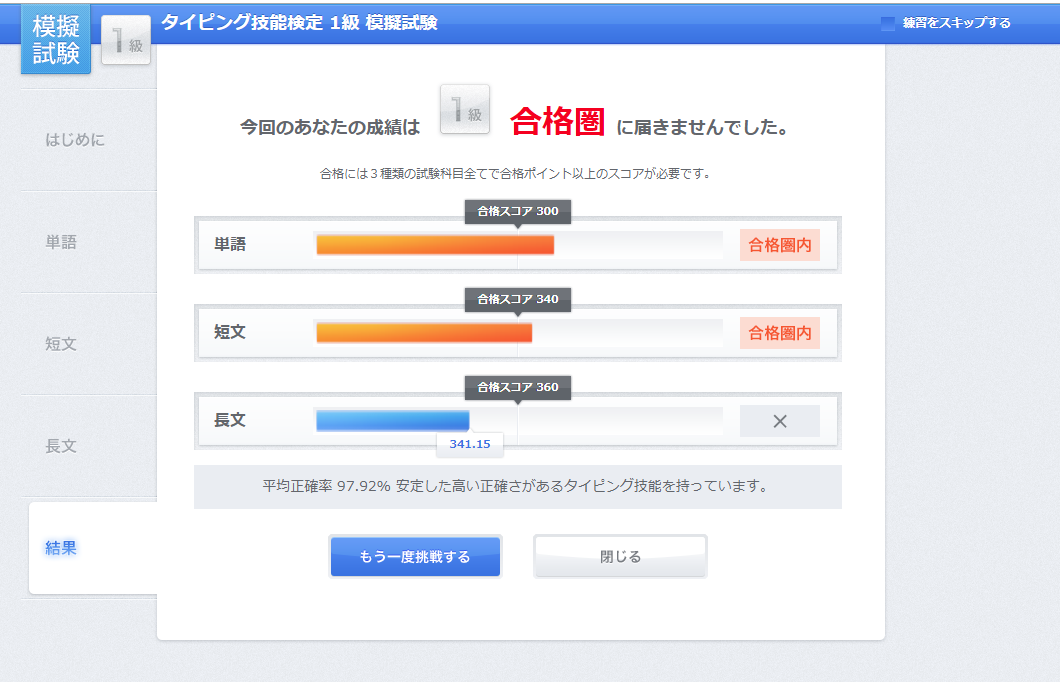 今の腕前で一級の模擬試験を受けてみた感じはこんな感じです。